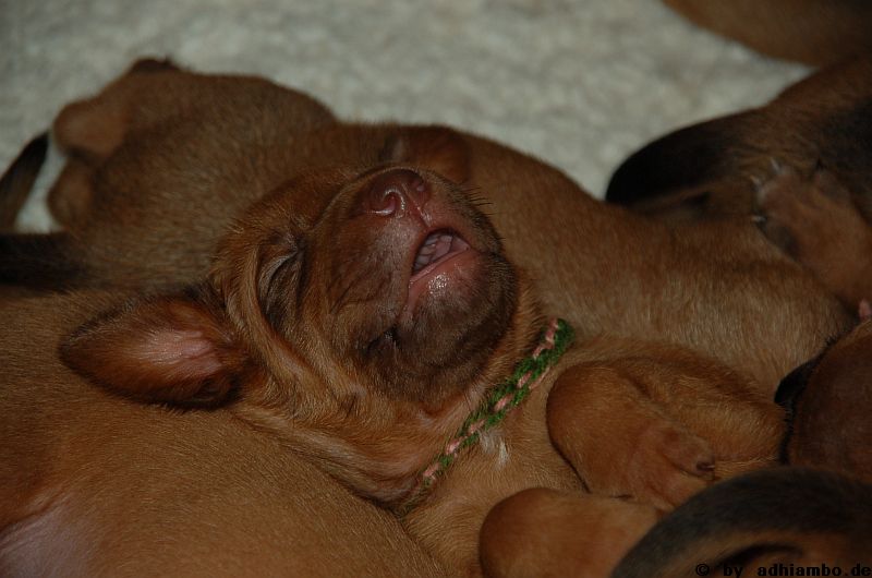 Hey Leute, hier bin ich wieder, Sternchen. Ich bin der Livernose-Rüde mit dem braunen Halsbändchen. Am Samstag waren wir 19 Tage alt. Wir bekommen jetzt schon jeden Tag so einen tollen Brei, den unsere Züchtermama Karin uns bringt. Der ist total superlecker und wir stürzen uns drauf wie die Wilden. Mama schimpft hinterher immer, weil wir nämlich noch gar keine Tischmanieren haben und uns gegenseitig immer so vollkleckern. Naja, da hat sie dann halt immer so viel Arbeit, um uns sauber zu bekommen.