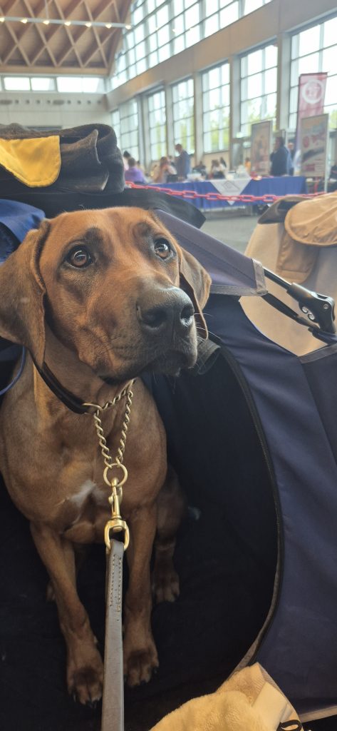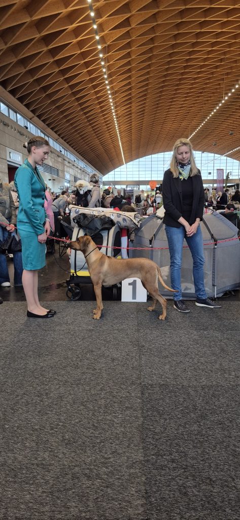 Juhu: Ouafa hat ihren ersten großen Punkt für den Deutschen Champion VDH geholt. Und das, obwohl sie gleich vier neue Umstände zu verkraften hatte. Zum ersten Mal eine Ausstellung in der Halle, zum ersten Mal eine CACIB mit vielen hundert Hunden und ebenso vielen Menschen, zum ersten Mal in der Zwischenklasse und zum ersten Mal mir ihrer neuen Handlerin Johanna Sieger. Wie immer hat die Lütte das gemanaged, als hätte sie nie was anderes gemacht. Fröhlich aus der Kennelbox blickend, sondierte sie unaufgeregt die Lage, schlief auch mal eine Runde und ging dann fröhlich mit Johanna, die sie erst einmal zuvor kurz gesehen hatte, in den Ring.