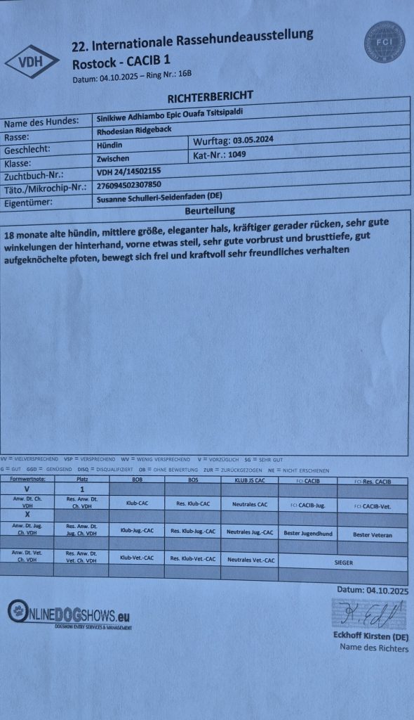 Noch ein Wort zu Johanna Sieger. Sie ist die Tochter von Julia Sieger, die in der Hundeszene einen hervorragenden Namen unter anderem beim Ringtraining hat. Gemeinsam züchten sie in Ellerhoop bei Hamburg Pharao Dogs (killarneys hartland) und haben früher auch Ridgebacks gezüchtet. Johanna, deren Nachname Programm ist, stellt seit ihrem 13. Lebensjahr hoch erfolgreich Hunde im In- und Ausland vor. Ich freue mich sehr, dass nicht nur Ouafa an Johanna einen Narren gefressen hat, sondern es auch umgekehrt so ist und Johanna eingewilligt hat, meine kleine Maus vorzustellen. Ich bin schon sehr gespannt, was die Zukunft bringen wird.
