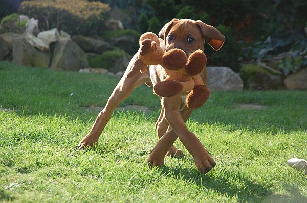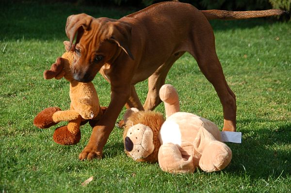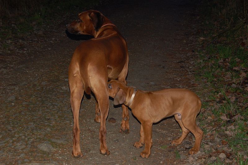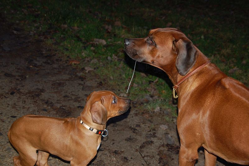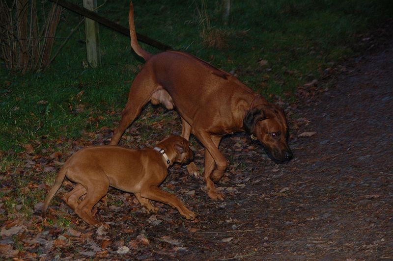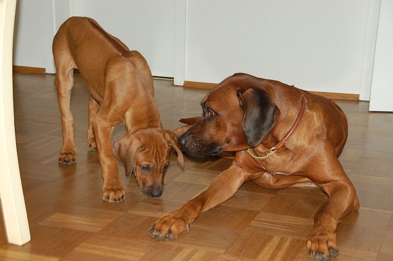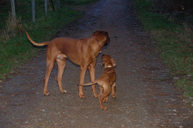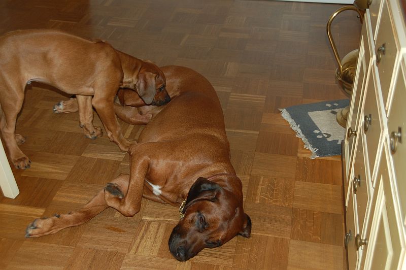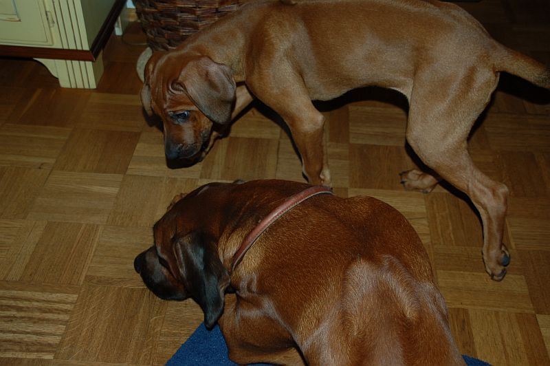 Adhiambo hat gestern fast der Schlag getroffen. Wuselt da doch tatsächlich ein Welpe bei Sigrid herum. Und der will auch noch mit ihm spielen und ist aufdringlicher als eine Schmeißfliege. Da hat mein Hund sofort beschlossen, den Zwerg einfach zu ignorieren. Das hat nun dem Kleinen nicht gefallen. Von Adhiambo auf den Kopf hüpfen, über ihn in Rute beißen bis hin zu einem kräftigen Kläffkonzert hat nichts geholfen. Der Große wollte nicht spielen. Nur Kuscheln durfte Waziri.
