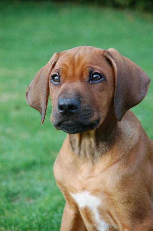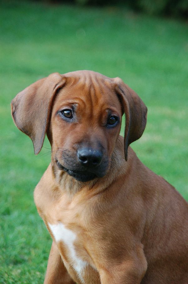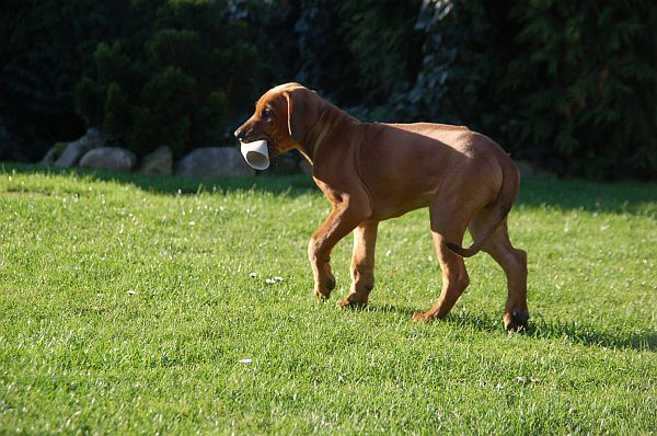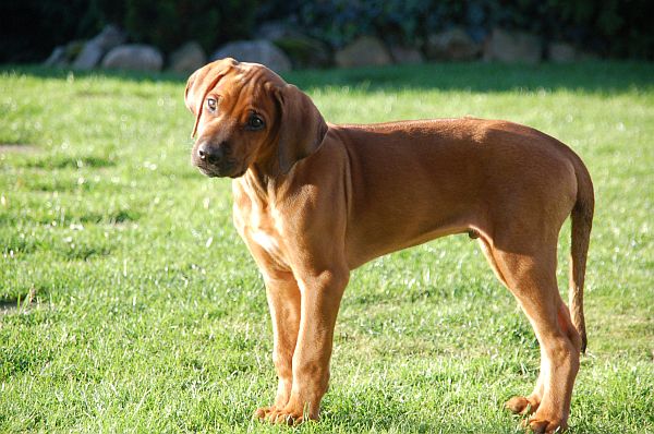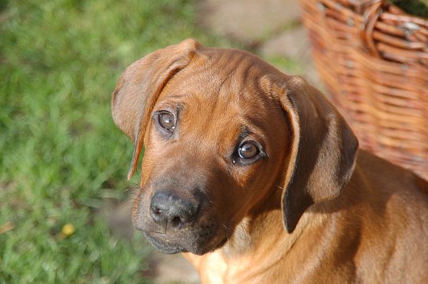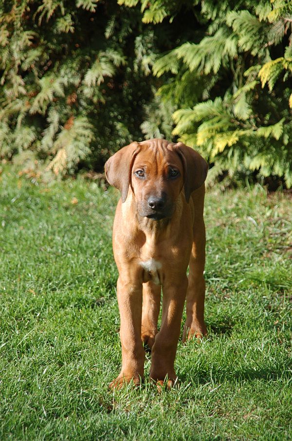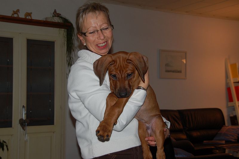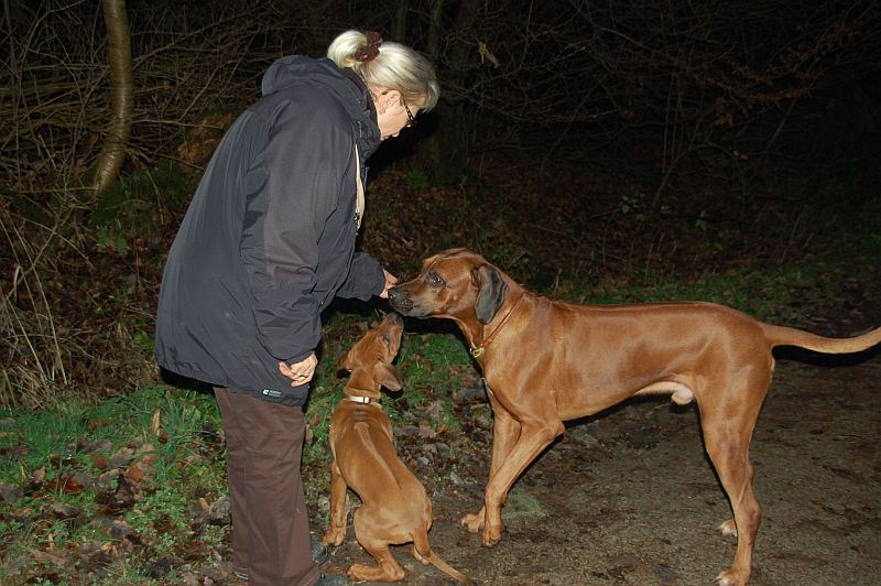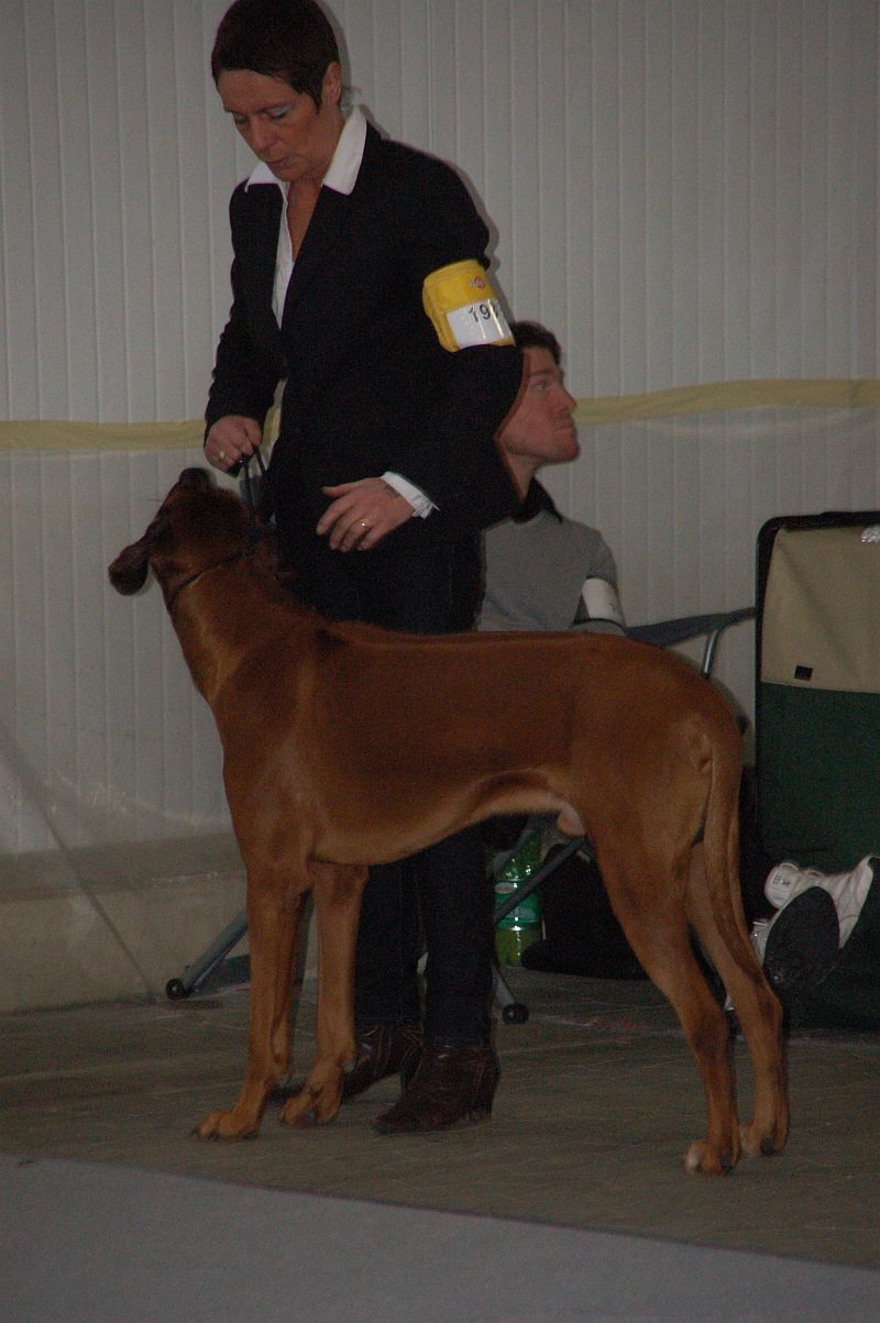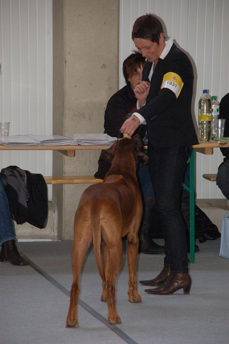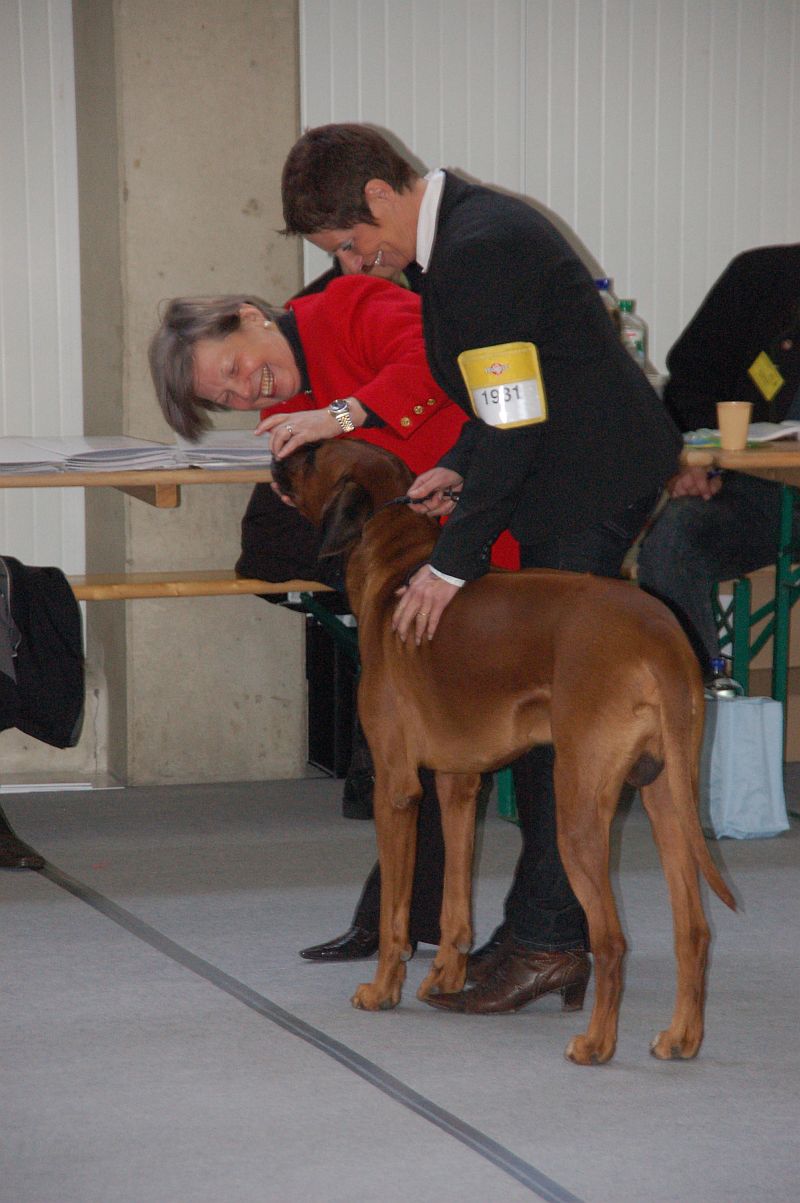 Frau Schicker beschied Adhiambo, freundlich und nervenfest zu sein. Er ließ sich auch mit 18 anderen Rüden im Ring nicht aus der Ruhe bringen. Sie fand ihn Alles in Allem korrekt, aber an der oberen Größengrenze. Außerdem bevorzugt sie die hellen Ridgebacks. Ergebnis war ein sg.