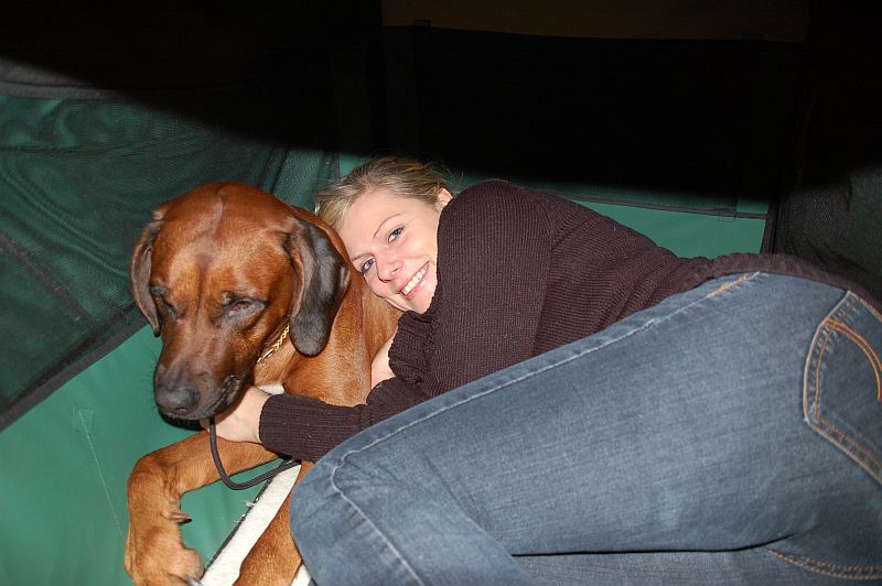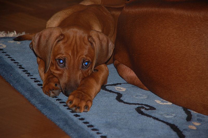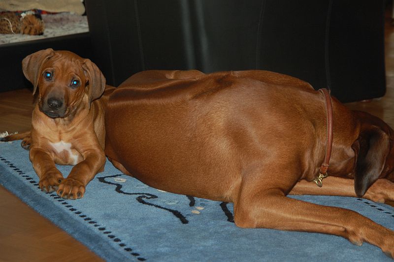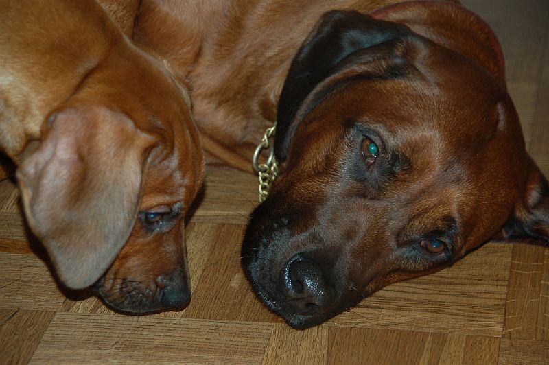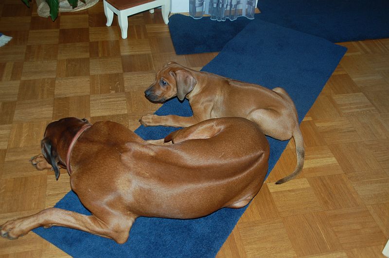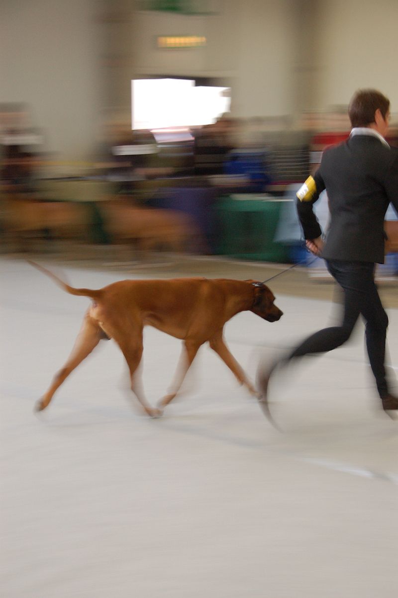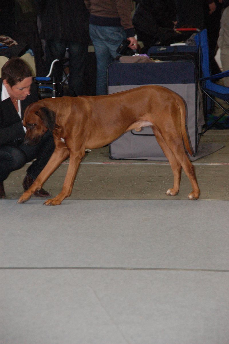 Am vergangenen Wochenende hatten wir die Gelegenheit, direkt in Kassel bei Gisa Schicker auszustellen. 130 Ridgebacks waren gemeldet. In Adhiambos Klasse starteten 18 Rüden. Adhiambo nahm die anderen Hunde total gelassen hin, war fast ein bißchen zu gleichgültig. Die lange Wartezeit vertrieben wir uns durch Zuschauen und Stöbern in den anderen Hallen. Helena legte sich auch mal zu Adhiambo in den Kennel und ruhte sich dort aus.
