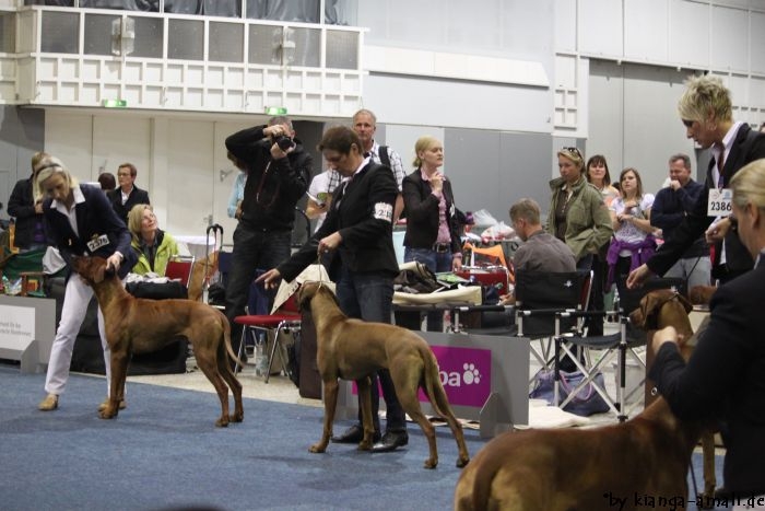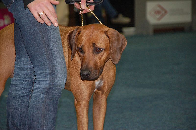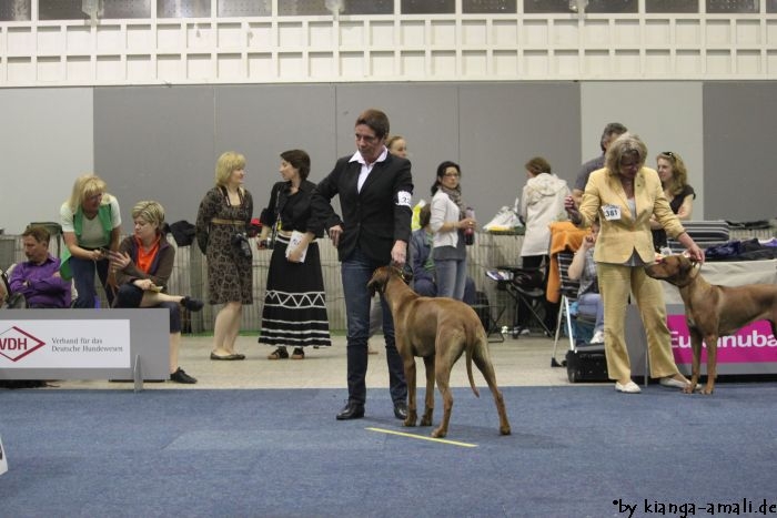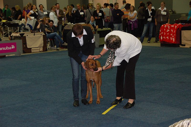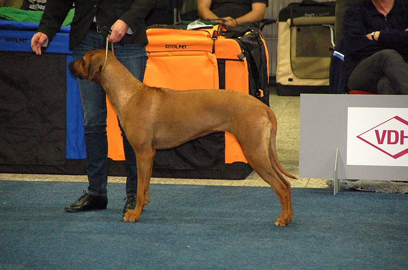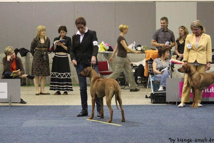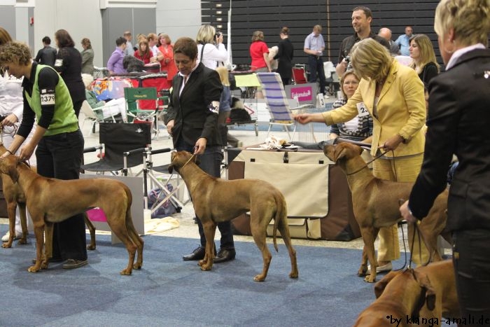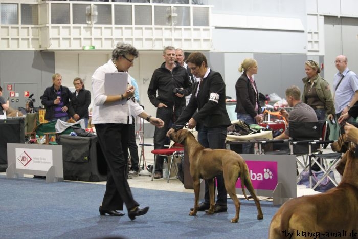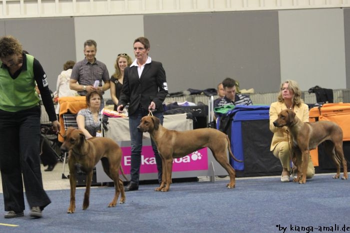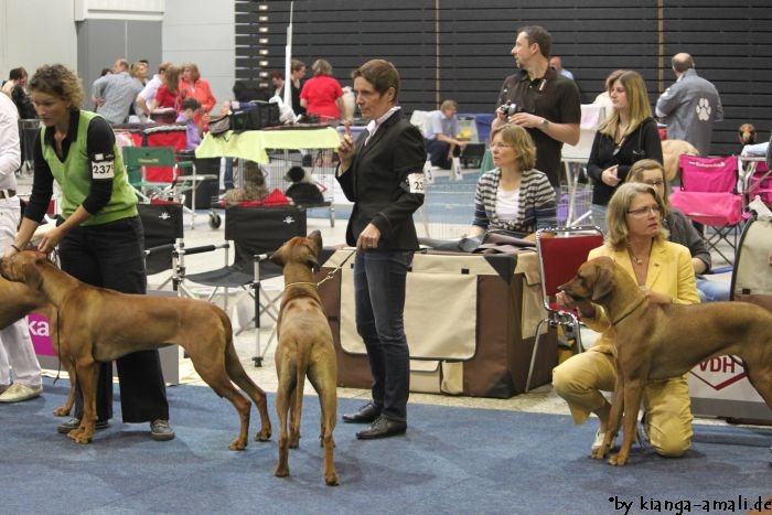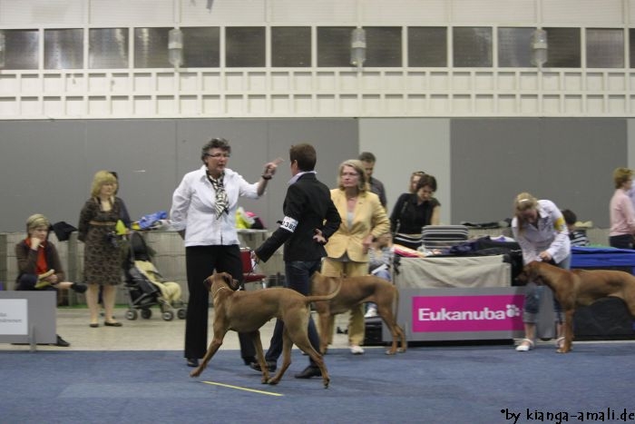 26 Hündinnen waren in der Junghundeklasse genannt. Wir kamen unter die letzten fünf, mussten dann aber leider doch vor der Platzierung noch den Ring verlassen. Richterin Petra Stracke entschied sich gegen eine Platzierung von Senta, weil sie den Rücken ein wenig hochgezogen hatte. Die Familienehre hielt aber Sentas Schwester Halvenboom Hope Naima aufrecht, die ein V4 bekam.