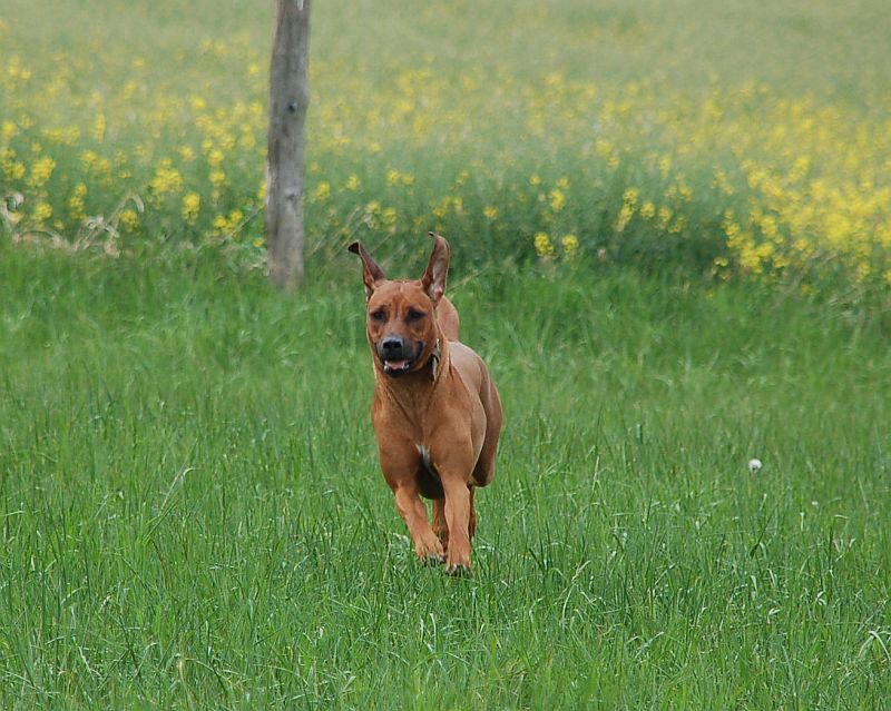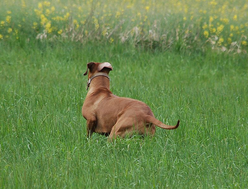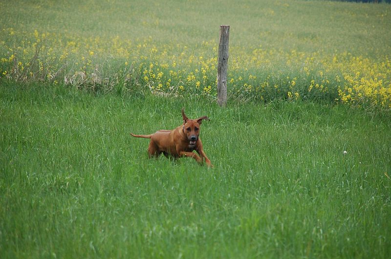 Leider habe ich während des Spaziergangs einen Hasen übersehen, der mitten in einer hohen Wiese saß. Senta flitze wie ein geölter Blitz hinterher. Adhiambo ebenfalls, er war aber gleich wieder da. Senta kam kurz zurück, schaute, ob wir noch alle da sind und verschwand sofort wieder in dem Rapsfeld, in dem sich der Hase verkrümelt hatte. Ich habe, glaube ich, während der ganzen cirka drei Minuten, die Luft angehalten. Ab dann gab’s für Senta erstmal Leinenpflicht. Mit der kleinen Madame werde ich wohl mal ein Anti-Jagd-Seminar besuchen :-).