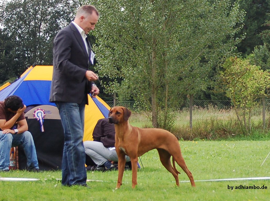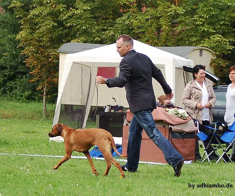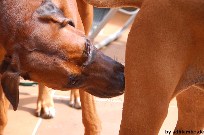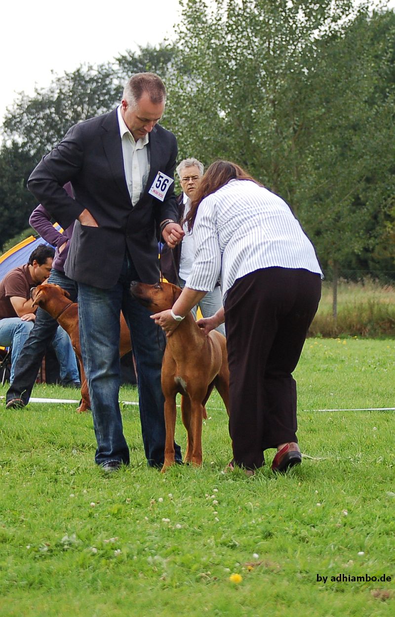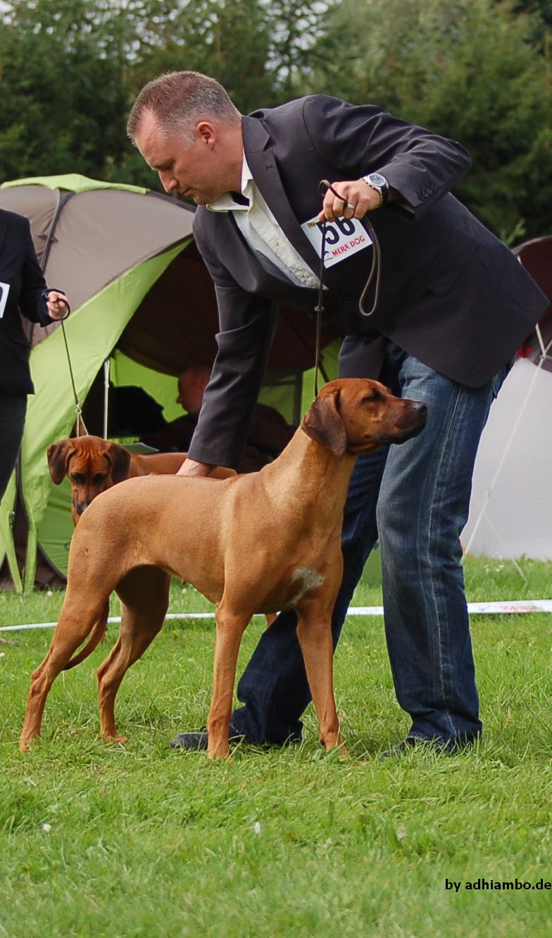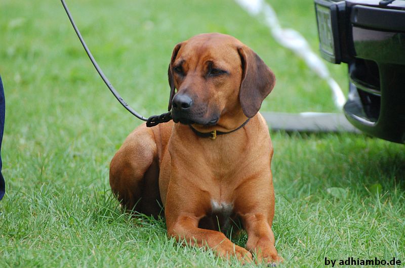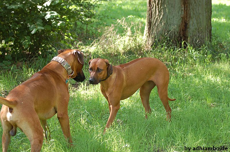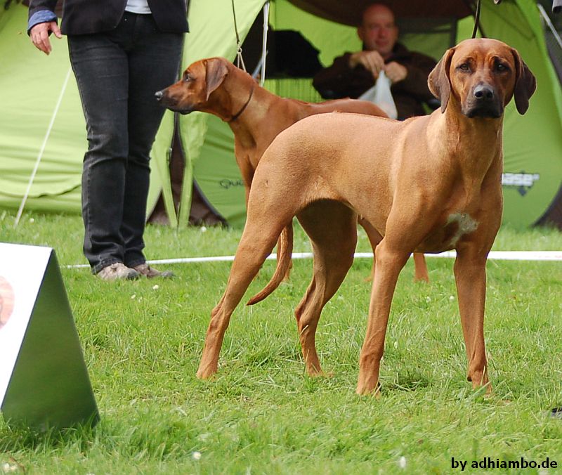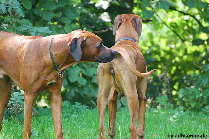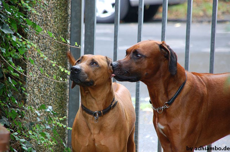 Adhiambo wird demnächst seinen ersten Deckakt haben. Die Hündin ist Zungwini Ife aus dem Kennel der DZRR-Hauptzuchtwartin Karin Zühlke. Nicht zu Unrecht ist die erfahrene Züchterin auf die Langlebigkeit und Gesundheit ihrer Nachzucht stolz. So lebte bis vor kurzem neben Ife auch noch die 14 1/2 jährige Beauty bei Karin Zühlke.
