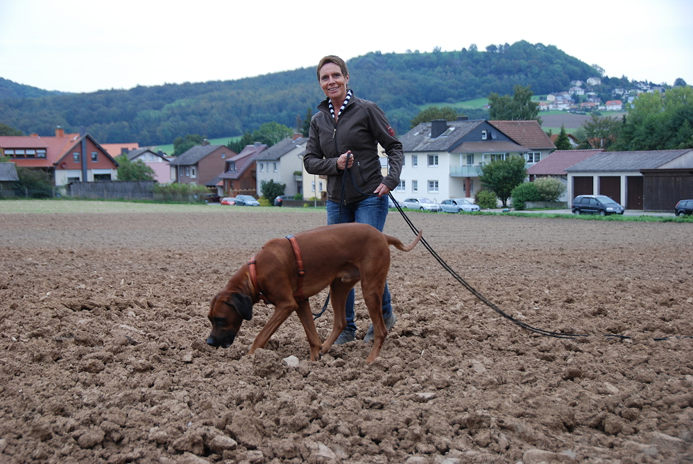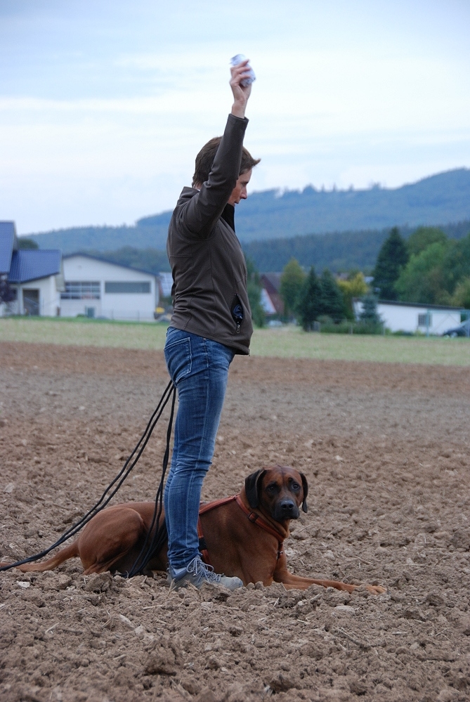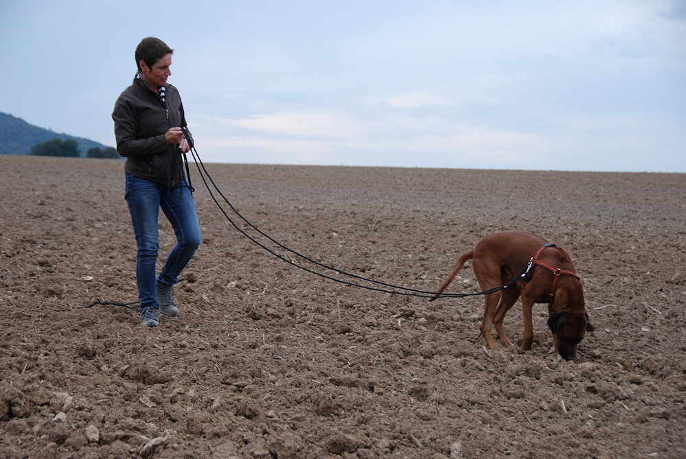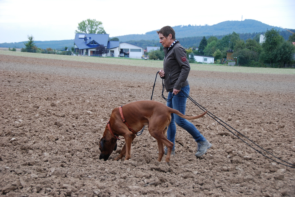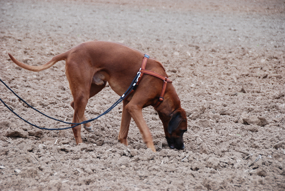 Adhiambo hat in diesem Jahr erst einmal am Fährtentraining im Frühjahr teilgenommen. Um so erstaunter war ich jetzt, als er auf schwierigen Unterboden, auf umgeplügtem Ackerboden, die gelegte Fährte entlangschnurrte, die Winkel nahm, als wenn ein Wegweiser da stehen würde, und sich bei den Gegenständen brav ablegte. Ich war total begeistert. natürlich hat er auch dementsprechend viel Belohnung hinterher bekommen. Ich bin sooo stolz auf ihn <3