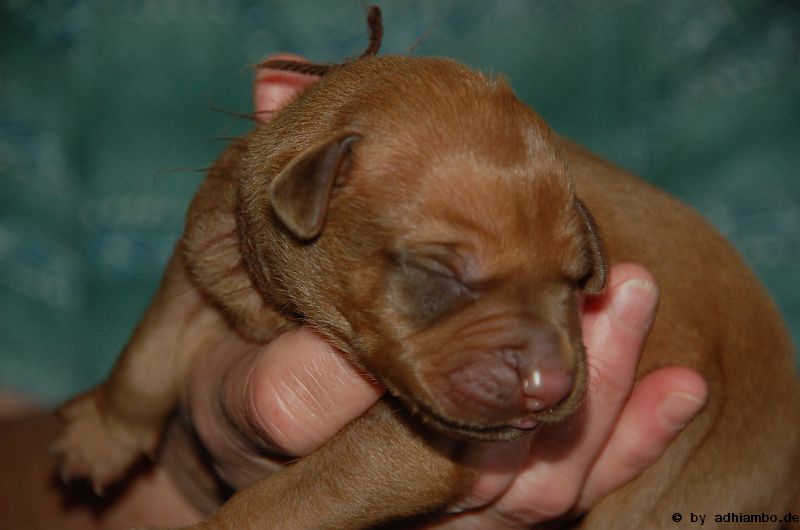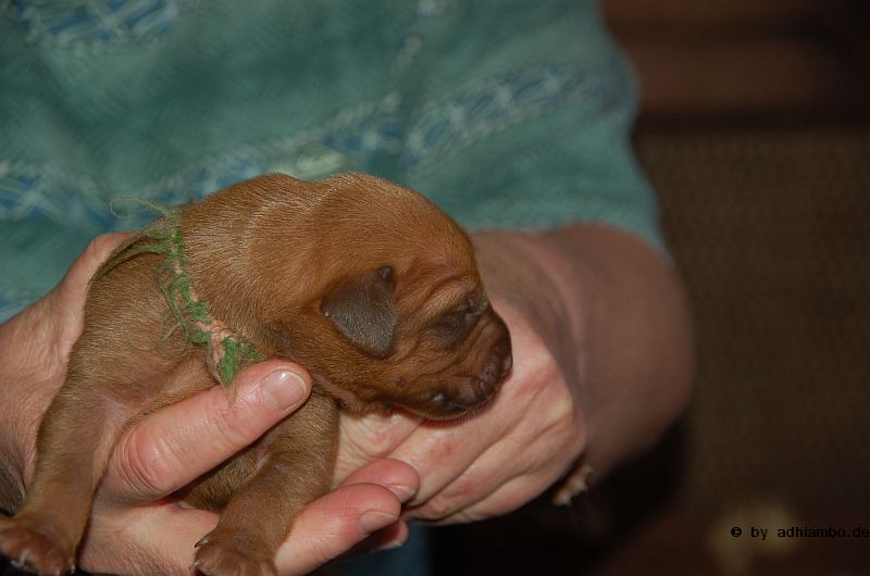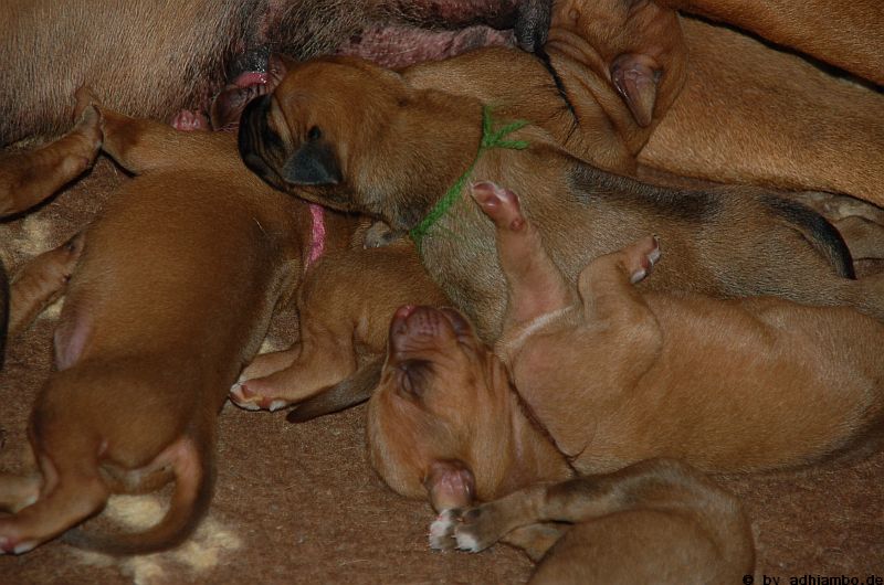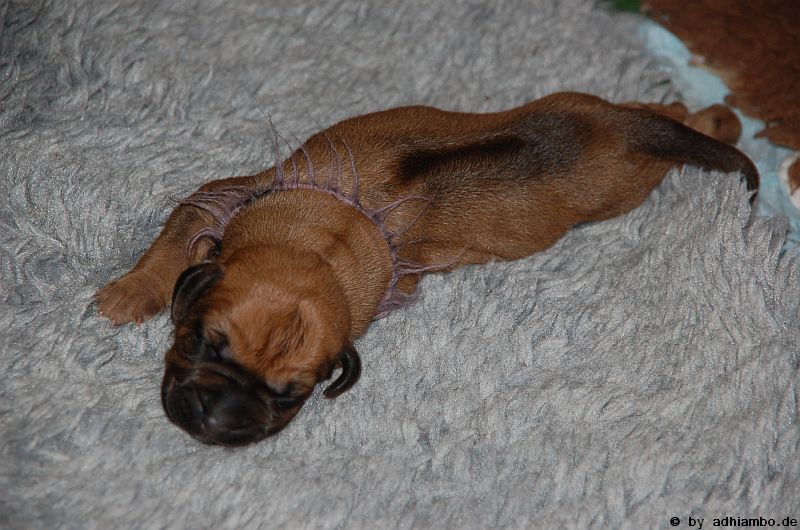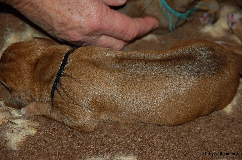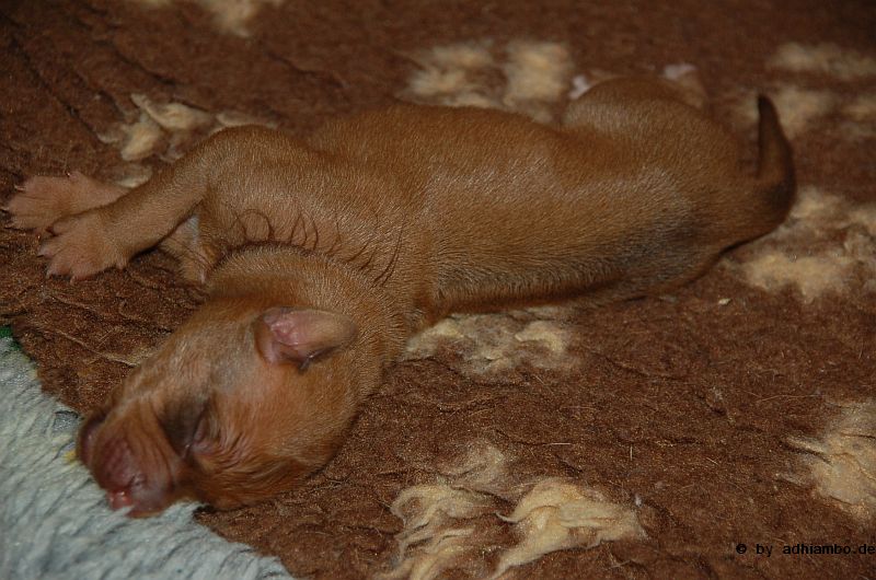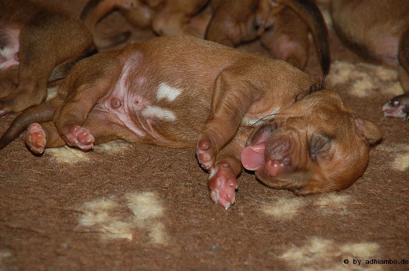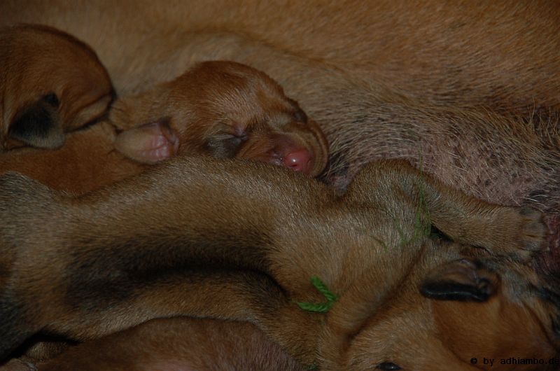 Hallo, ich bin Sternchen. Ich bin ein kleiner Livernose-Rüde und wurde gemeinsam mit zehn Geschwistern vor drei Tagen im Kennel Zungwini geboren. Ihr könnt Euch gar nicht vorstellen, wie meine Züchtermama Karin geguckt hat, als ich auf die Welt kam. Hihi, es wußte nämlich keiner, dass mein Papa Adhiambo das Livernose-Gen trägt. Mit mir sind wir vier Livernose-Rüden, die auf die Welt kamen. Aber ich bin was Besonderes: Ich habe nämlich ein Krönchen auf dem Kopf. Das habe ich von meinem Papa geerbt. Die vier Mädels sehen alle aus wie mein Papa. Sie haben eine dunkle Maske, wie auch drei meiner weiteren Brüder. Wir verstehen uns alle prima: Nur wenn wir an der Milchbar sind, gibt’s manchmal Zoff. Da meint mein dicker Liverbruder, er hätte Vorrechte – und das nur, weil er bei der Geburt 650 Gramm gewogen hat. So ein Angeber. Den hole ich schon noch ein! Wenn ihr immer aufmerksam diese Seite verfolgt, könnt ihr mehr von mir erfahren. So ab und an werde ich mich hier melden. Fotos von mir und meinen Geschwistern gibt es dann auch wieder. Jetzt muss ich aber erstmal ein Schlückchen zu mir nehmen – und dann ’ne Runde pennen.