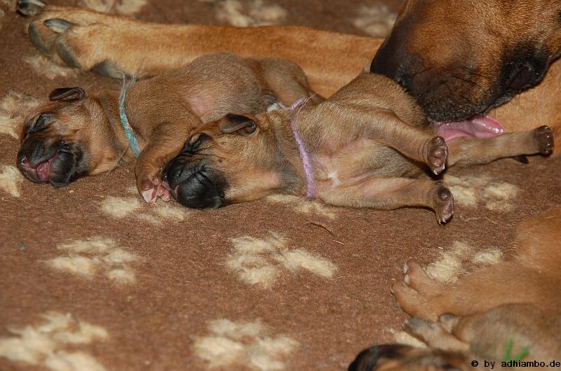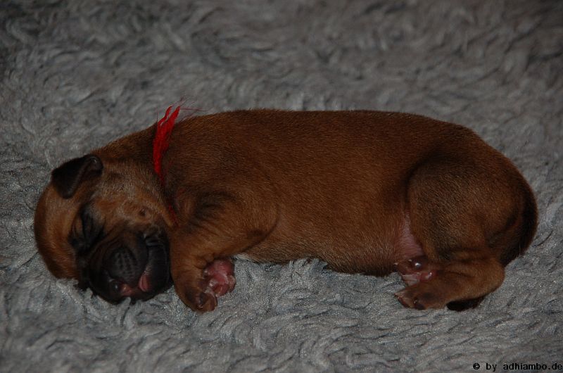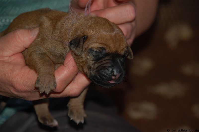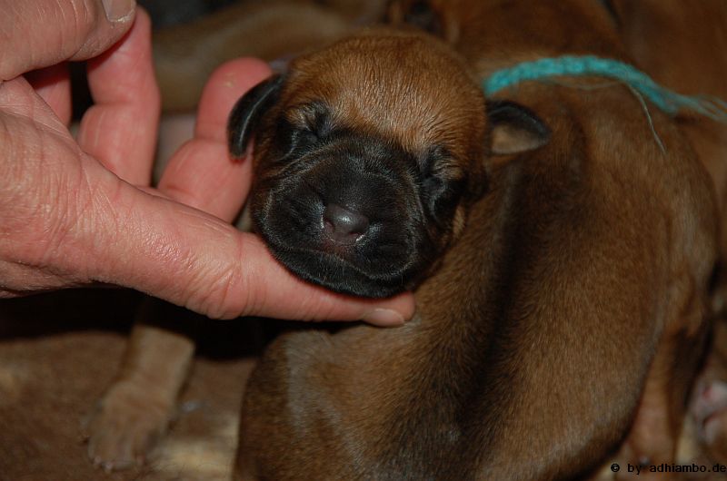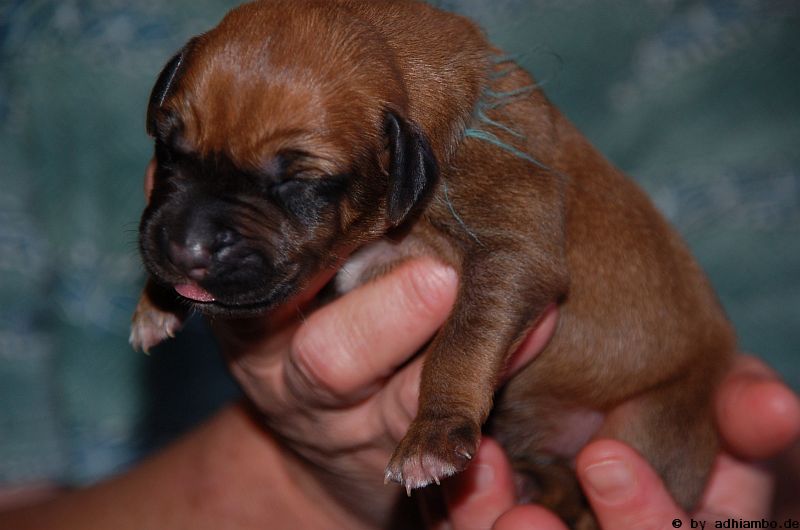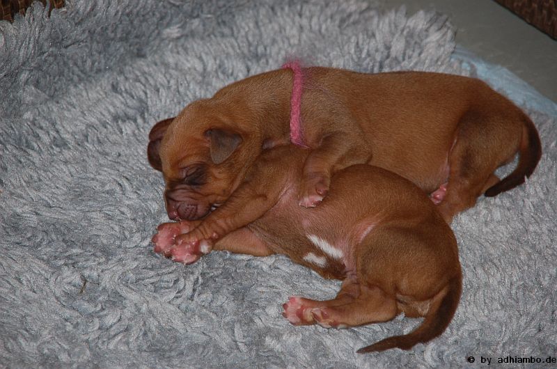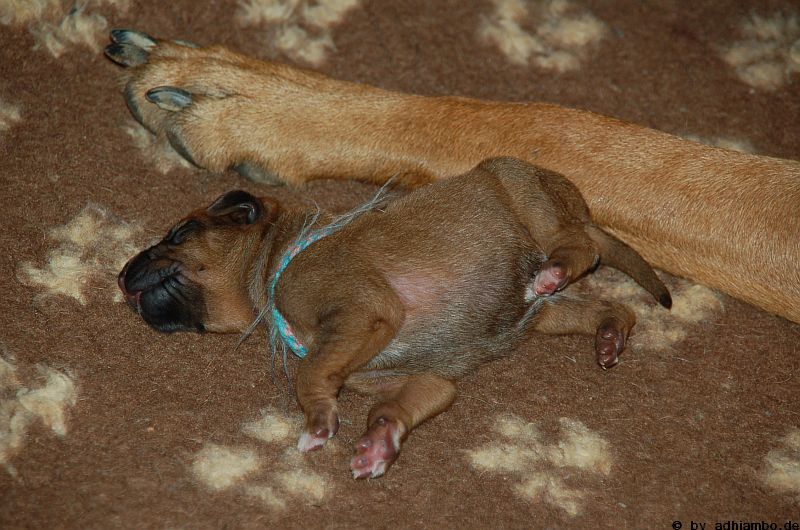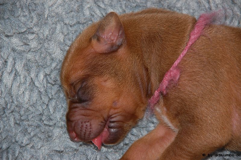 Hallo, ich bin Sternchen. Ich bin ein kleiner Livernose-Rüde und wurde gemeinsam mit zehn Geschwistern vor drei Tagen im Kennel Zungwini geboren. Ihr könnt Euch gar nicht vorstellen, wie meine Züchtermama Karin geguckt hat, als ich auf die Welt kam. Hihi, es wußte nämlich keiner, dass mein Papa Adhiambo das Livernose-Gen trägt. Mit mir sind wir vier Livernose-Rüden, die auf die Welt kamen. Aber ich bin was Besonderes: Ich habe nämlich ein Krönchen auf dem Kopf. Das habe ich von meinem Papa geerbt. Die vier Mädels sehen alle aus wie mein Papa. Sie haben eine dunkle Maske, wie auch drei meiner weiteren Brüder. Wir verstehen uns alle prima: Nur wenn wir an der Milchbar sind, gibt’s manchmal Zoff. Da meint mein dicker Liverbruder, er hätte Vorrechte – und das nur, weil er bei der Geburt 650 Gramm gewogen hat. So ein Angeber. Den hole ich schon noch ein! Wenn ihr immer aufmerksam diese Seite verfolgt, könnt ihr mehr von mir erfahren. So ab und an werde ich mich hier melden. Fotos von mir und meinen Geschwistern gibt es dann auch wieder. Jetzt muss ich aber erstmal ein Schlückchen zu mir nehmen – und dann ’ne Runde pennen.