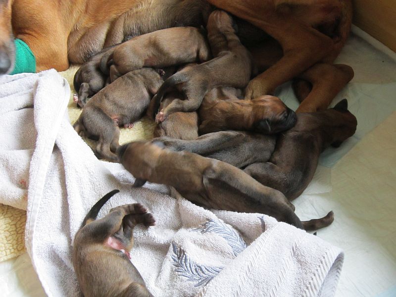 Heute früh kamen in Stockelsdorf im Kennel Chinola Maanhaar elf kleine Ashira-Adhiambokinder zur Welt. Einen kleinen Rüden mussten Heinz und Sylvia leider über die Regenbogenbrücke ziehen lassen, aber die anderen zehn sind quietschfidel und zeichnen sich durch großen Hunger aus. Es sind sechs kleine Rüden und vier Hündinnen. Alle haben, wie schon bei Adhiambos vorigen Kindern, jeweils eine Ridge und zwei Crowns. Wir sind sehr froh, dass Ashira so süßen Welpen das Leben geschenkt hat und danken Sylvia und Heinz Leder für das große Vertrauen in unseren Adhiambo.