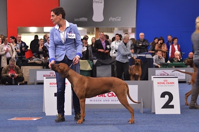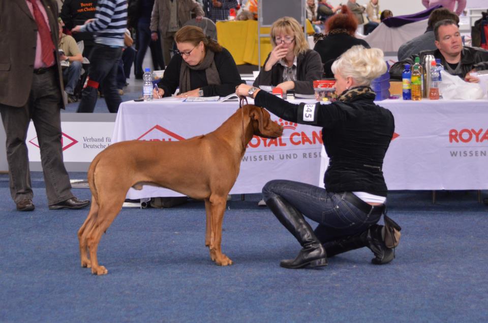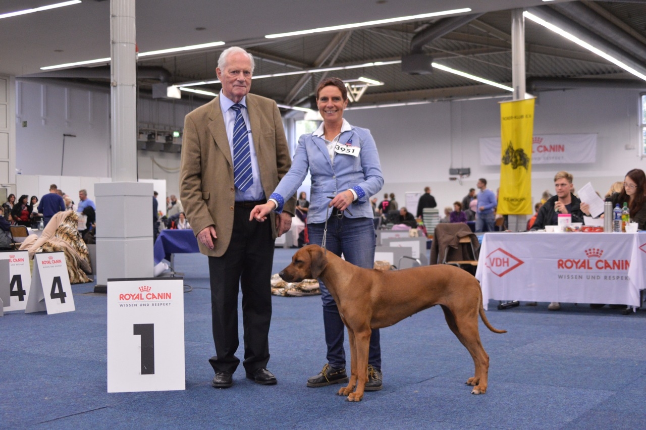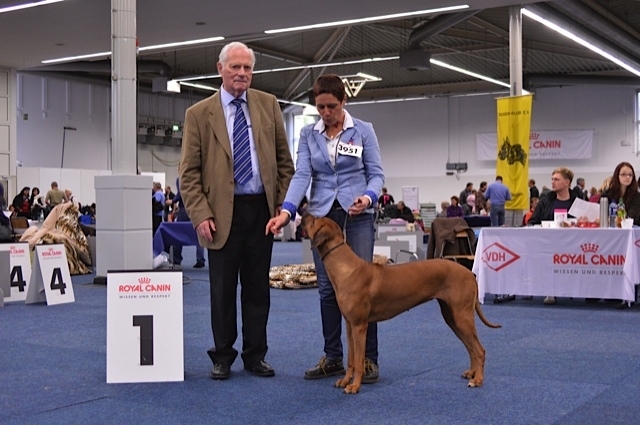Wow, was für ein Wochenende. Am Freitag fuhren wir zur nationalen Ausstellung nach Dortmund. Die Richterin Helga Jürgens zeigte sich als besonders streng und vergab bei den Rüden ein einziges V1! Ansonsten gab es nur sg und g. Auch bei den Hündinnen ging es ähnlich weiter. Nur in der Jugendklasse sowie in der Championklasse gab es ein V1. Und dann kam die offene Klasse. Hier zeigte sich unsere Sentamaus wieder gewohnt aufmerksam und vor allem begeistert beim Laufen. Frau Jürgens belohnte sie mit einem V1, der Anwartschaft für den Deutschen Champion und dem CAC Club RRCD. Ich war überglücklich über das Ergebnis und dachte in diesem Moment noch nicht daran, dass das wohl noch zu toppen sei.