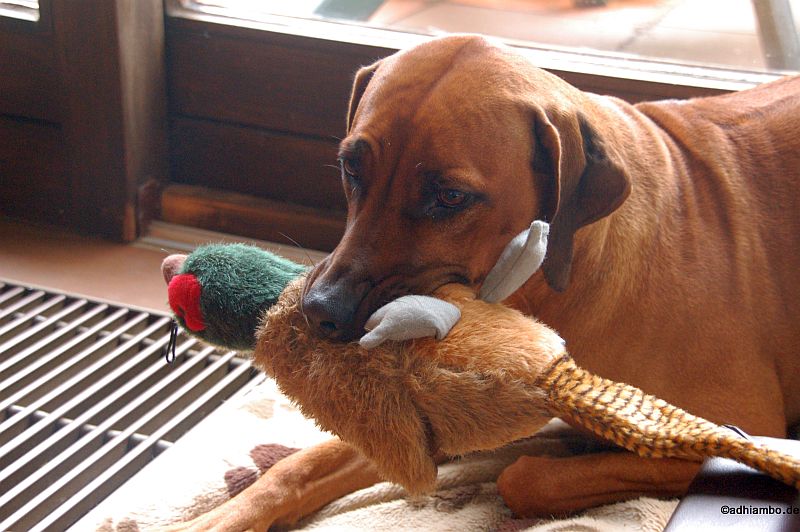 Wie immer durfte sie sich nach den beiden Ausstellungstagen in den Verkaufshallen etwas aussuchen. Ihre Wahl fiel auf einen großen Stofffasan, der Originalgeräusche von sich gibt, und auf eine leckere Hundewurst.