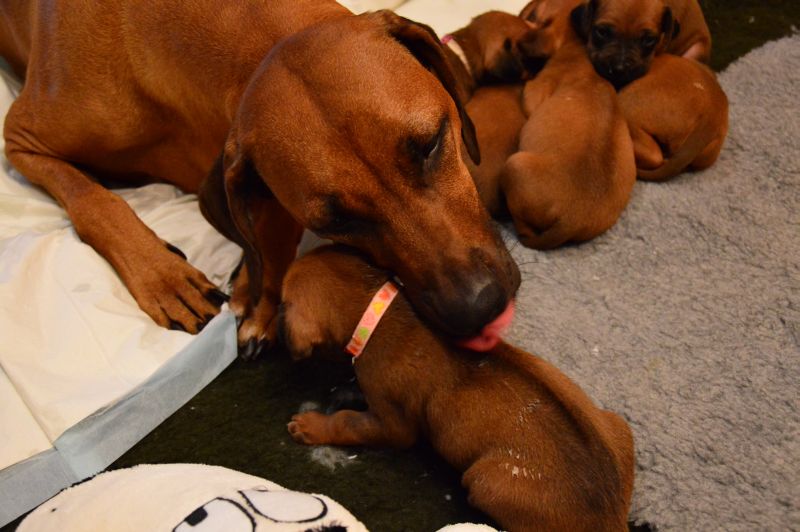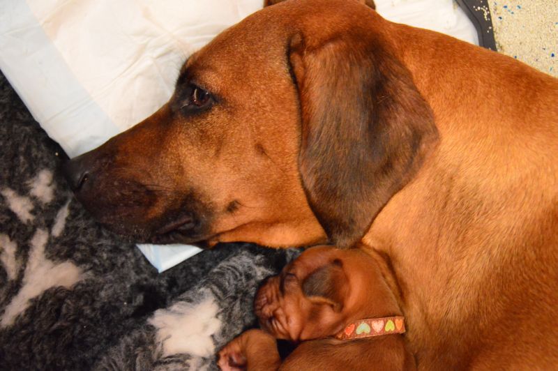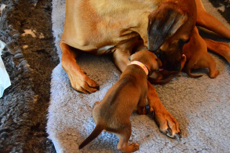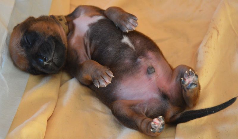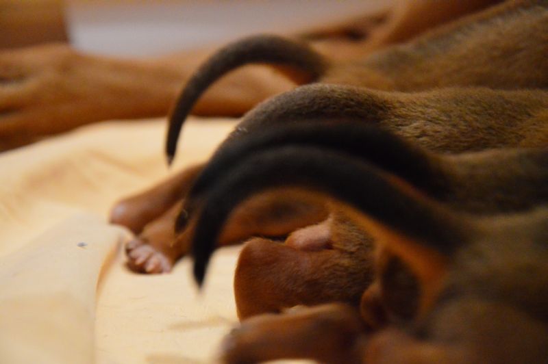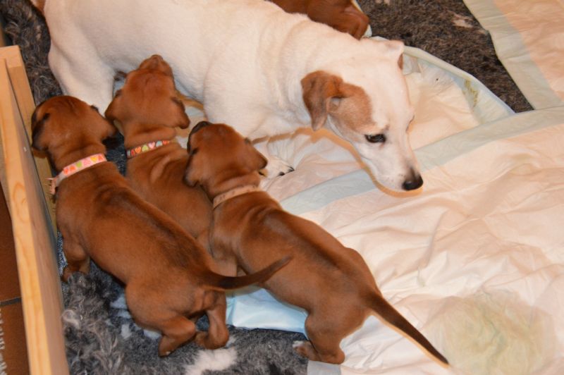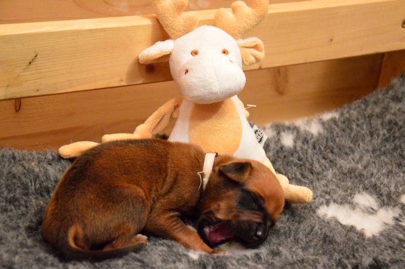 Seit gestern öffnen unsere Kleinen peu à peu ihre Augen. Überhaupt kann man jetzt ständig zuschauen, wie sie Fortschritte machen. Es wird versucht, die kleinen Beinchen zu benutzen und teilweise klappt das auch schon ganz gut. Es ist zu niedlich zu beobachten, wie der ein oder andere nach zwei drei Schritten umpurzelt und durch die Wurfkiste kugelt.Die Frustrationstoleranz ist offensichtlich sehr hoch. Unermüdlich wird wieder aufgestanden und der Laufkurs fortgesetzt. Senta leistet Höchstarbeit. Laufen macht hungrig. Und dementsprechend kehren die Kleinen zwischen ihren Übungen immer mal wieder an der Milchbar ein und nehmen einen Schluck. Sie nimmt das gelassen hin, putzt die kleinen Hinterteile und scheint eine überaus glückliche Mama zu sein. Lassen wir die Bilder sprechen!