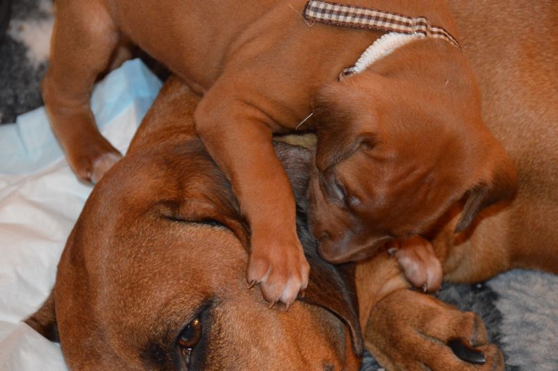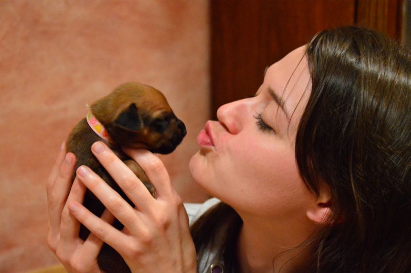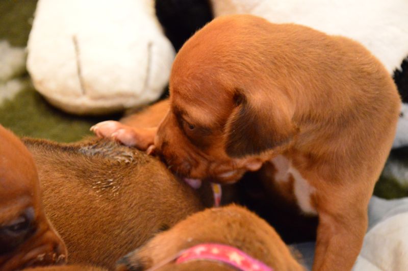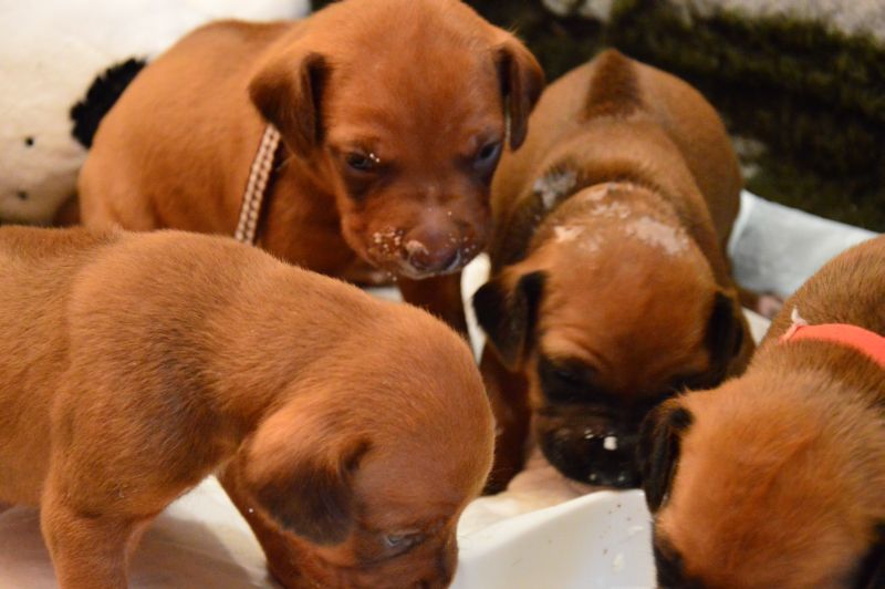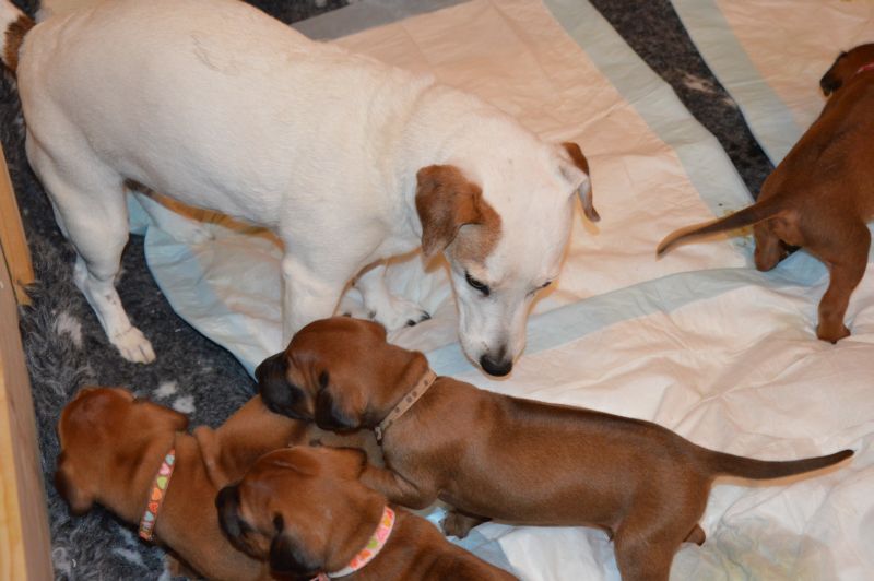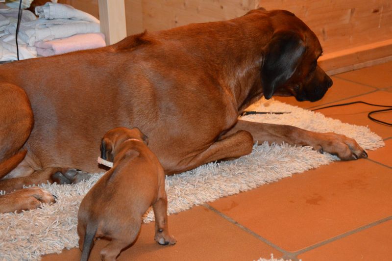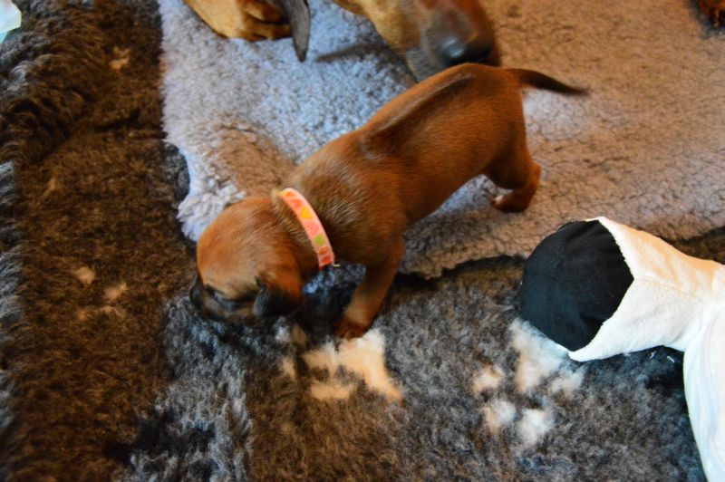 Sentas Kinder werden immer selbstständiger. Nicht nur das Fressen klappt schon prima (natürlich nach wie vor unter Auslassung jeglicher Tischmanieren). Jetzt wollen die Welpen auch die Welt erkunden. Immer häufiger stellen sie sich an der Wurfkiste hoch und möchten über den Rand schauen. Frieda durfte schon draußen herum laufen. Außerdem haben die Lütten unsere Erziehungsbeauftragte Chickie kennen gelernt, die begeistert in der Wurfkiste hockte und sich von den Kleinen beschnuppern ließ.