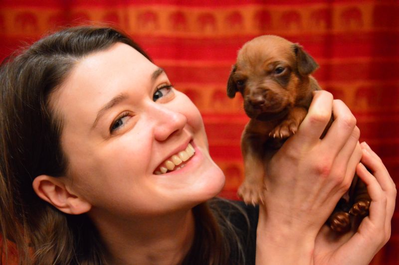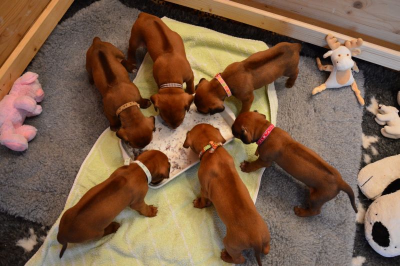 Seit zwei Tagen füttere ich unseren Kleinen Ziegenmilch und nachmittags etwas Tartar. Beides wird mit großer Begeisterung aufgenommen. Nach dem morgendlichen Ziegenmilch-Frühstück, das normalerweise auch in ein Ziegenmilch-Bad ausartet, hat Senta erstmal richtig gut zu tun. Sie muss ihre Kinder, die von oben bis unten bekleckert sind und kleben, wieder reinigen. Sauberer, aber nicht gesitteter geht’s bei der Fleischmahlzeit zu. Gut, dass die Lütten noch keine Zähne haben: Sie stürzen sich wie die kleinen Krokodile auf das frische Tartar und knabbern dabei auch gern an meinen Fingern.